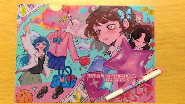 記念品はプログラムの表紙絵のデザインのA4クリアファイル、蛍光ペンを販売しています!
